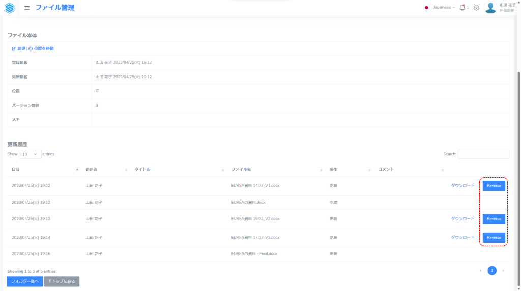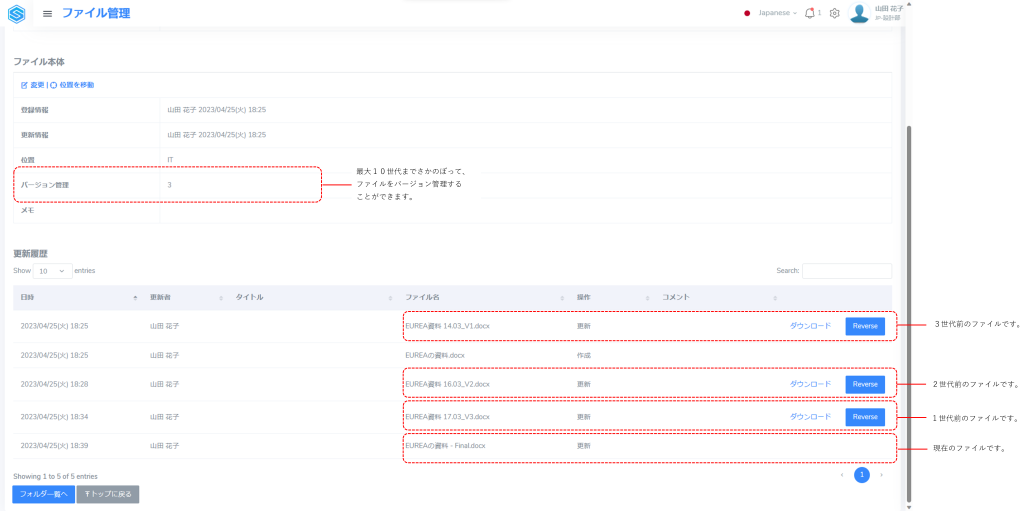 バージョン管理する世代を設定すると、ファイルの詳細画面の「更新履歴」セクションで、設定した世代までの過去のファイルを確認できます。