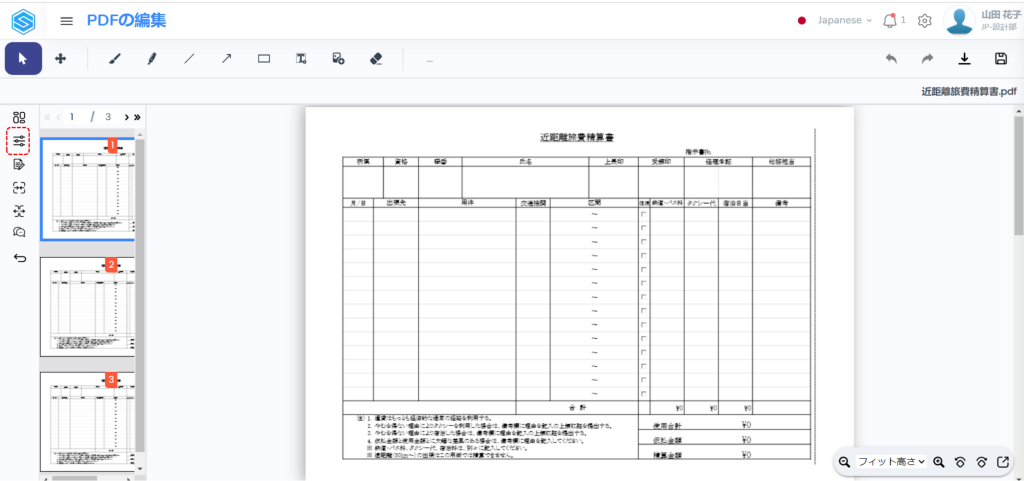 PDF編集のメイン画面の左のバーで「ページの編集とアレンジ」のアイコンをクリックします。