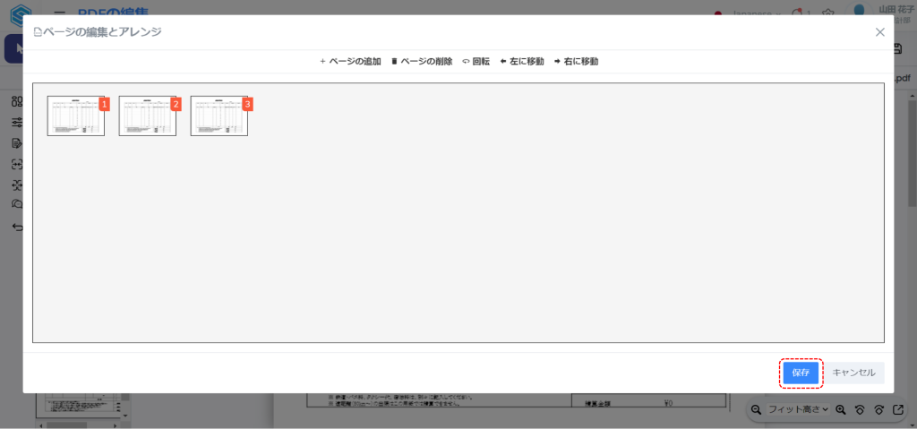 - ページの順序を変えるには、移動したいページを選択し、「右・左に移動」のボタンをクリックすると、右・左に移動します。