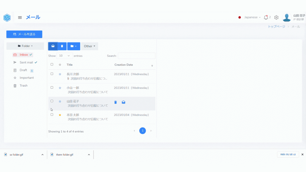 メールを削除したい場合、削除したいメールのチェックボックスを選択し、メールの削除アイコンをクリックします。