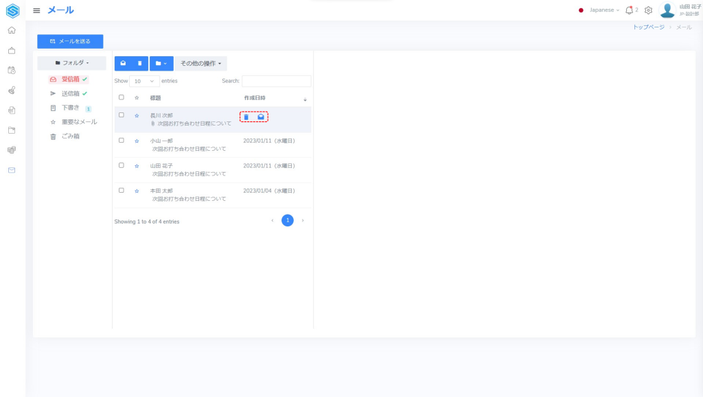 また、メール標題上にマウスポインターを持ってくると、メール削除アイコンと既読にするアイコンが表示されます。