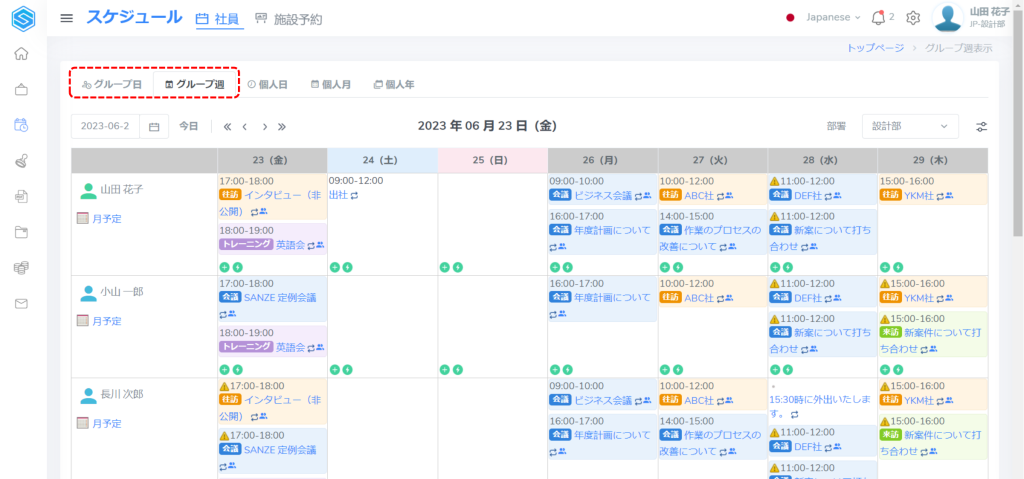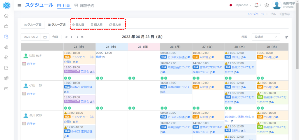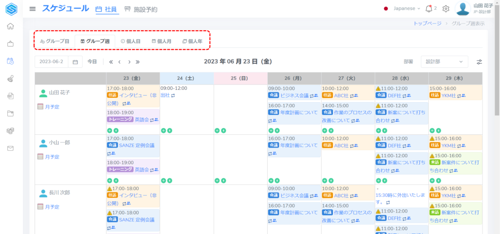 スケジュール表示は5つのタイプがあり、グループ日・グループ週・個人日・個人月・個人年があります。