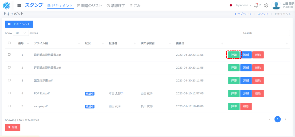「ドキュメント」・「転送のリスト」の部分で1ファイルごとに、「押印」ボタンがついています。押印の操作を行うために、このボタンをクリックします。