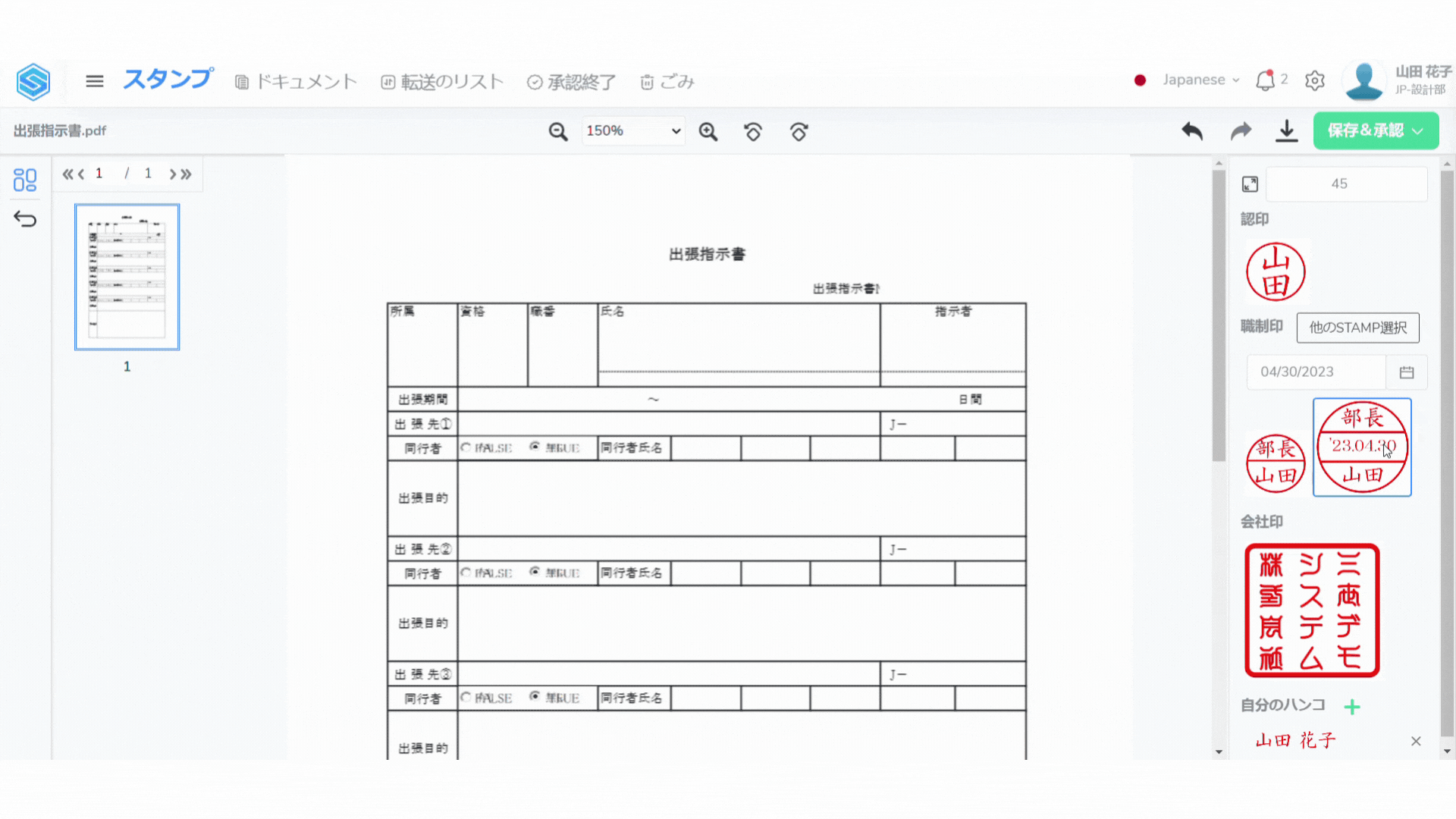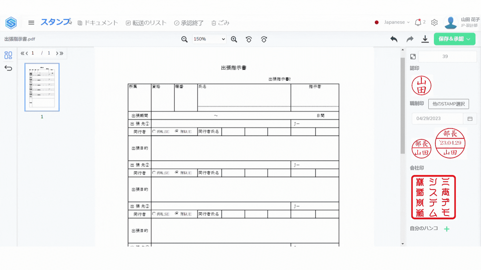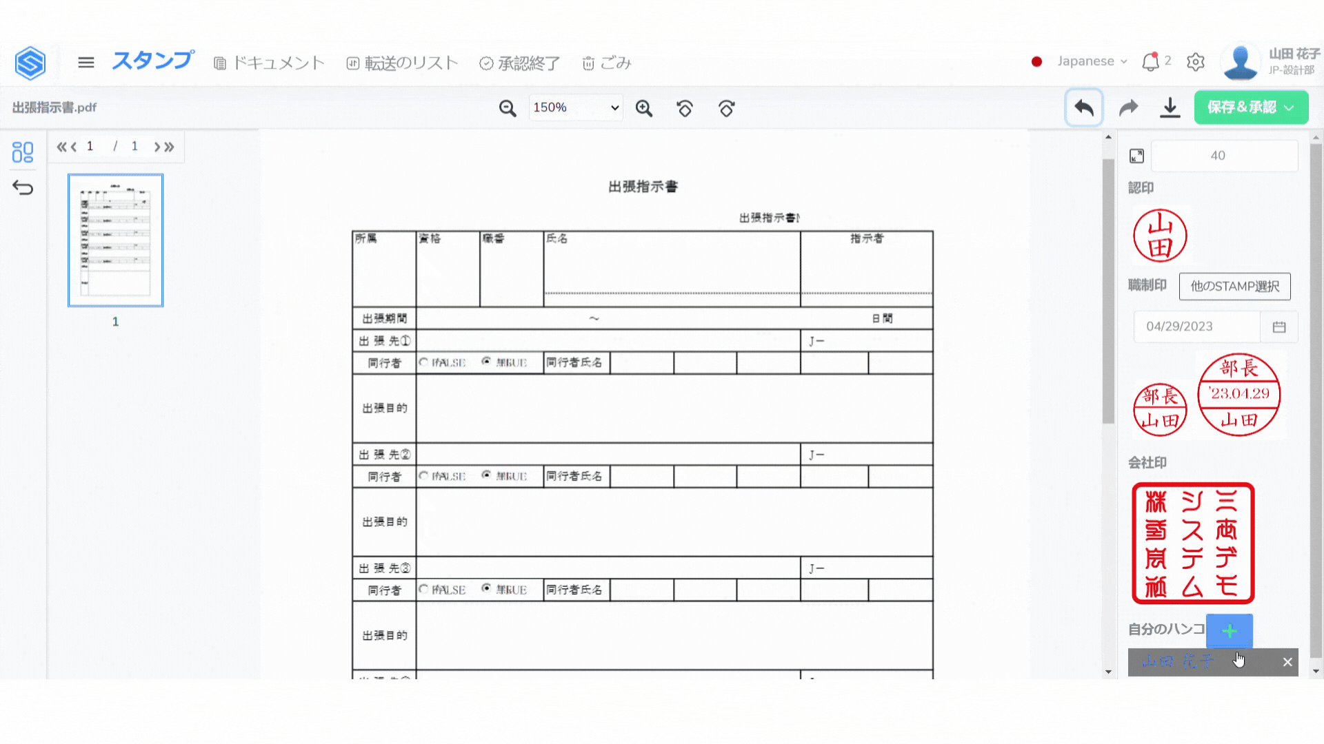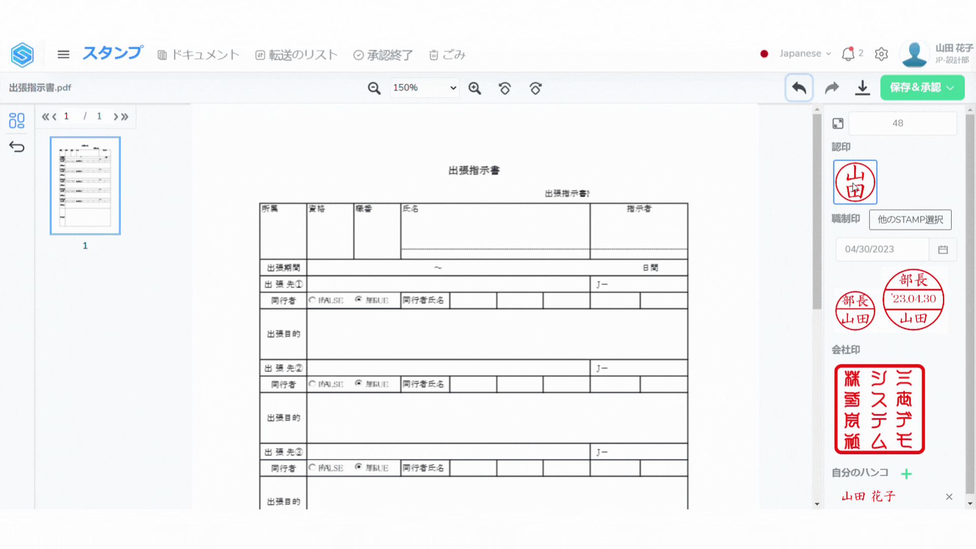 様々なタイプの印鑑や署名をカスタマイズすることができます。管理者として、認印、職制印、会社印など、さまざまな種類の印鑑をアップロードして管理する機能があります。以下で、印鑑を調整できます。