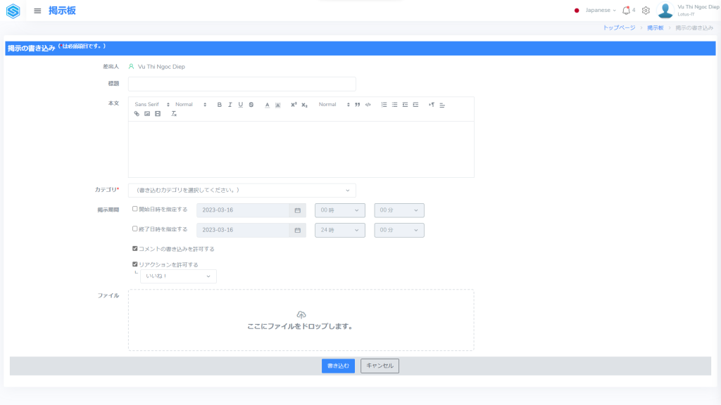 本機能は、スマートフォンやタブレット、PCなどのデバイスから直接掲示を公開できる機能です。掲示作成時には、受信者カテゴリ、掲示開始時間、掲示終了時間、コメントの許可・不許可、ファイルの添付などが設定できます。