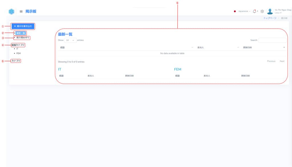 ②カテゴリ掲示板の最新一覧⑤掲示板の任意に作成したカテゴリ