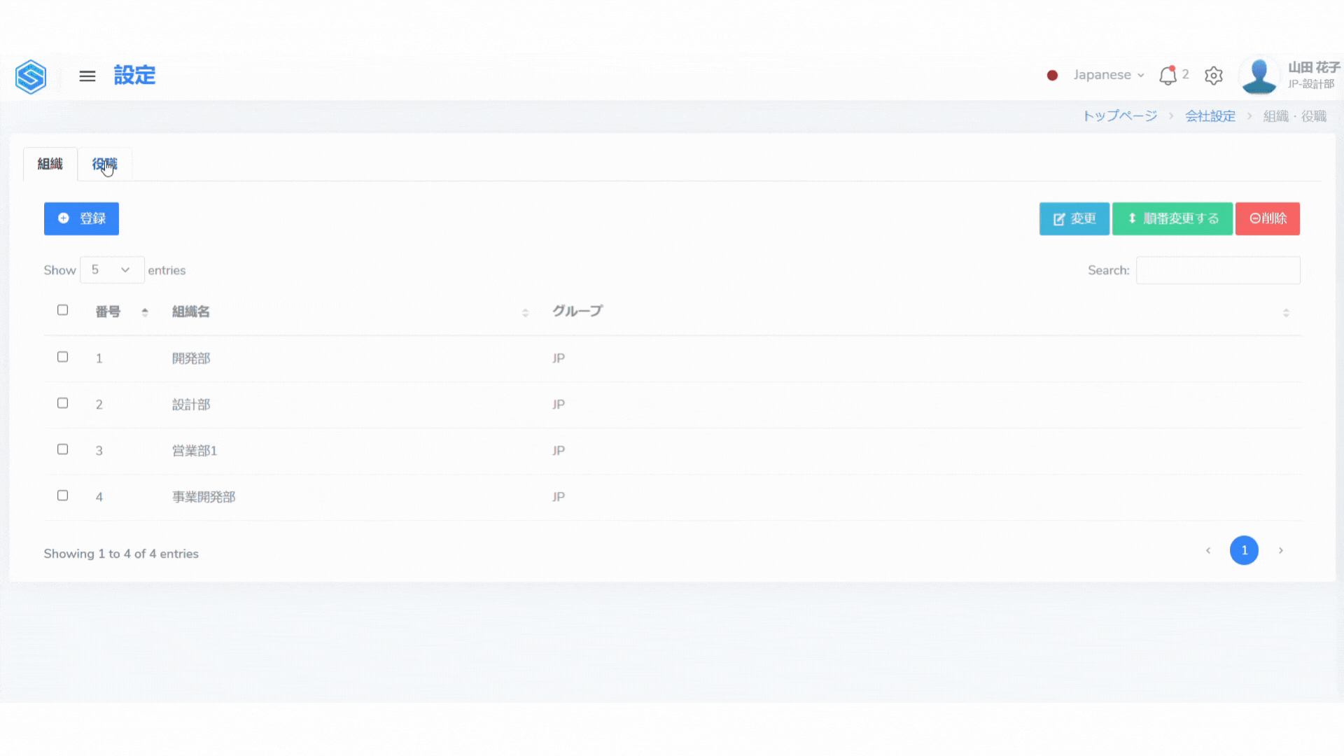 組織または役職のタブを選択し、「登録」のボタンをクリックすると、組織名を入力したり、部署のスタッフリストから矢印で選択することで、その組織や役職に割り当てることができます。割り当てが完了したら、「登録」のボタンをクリックします。