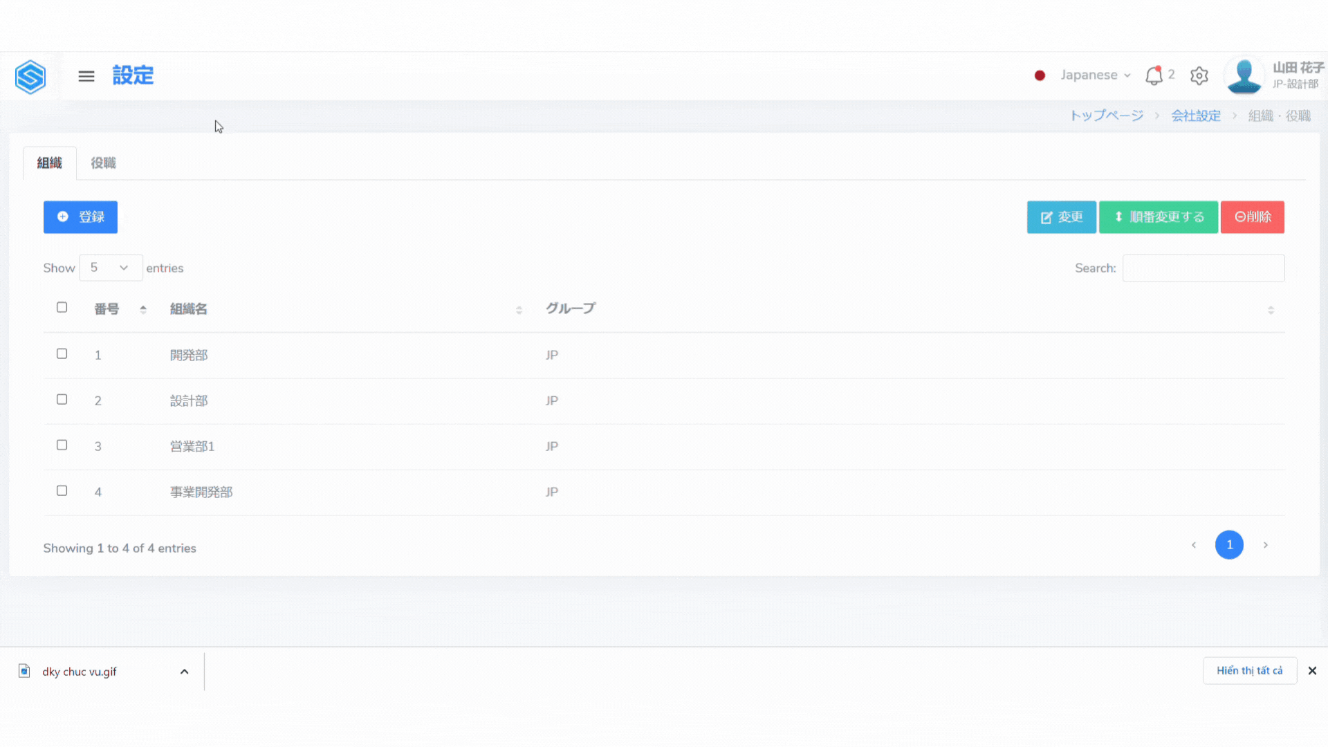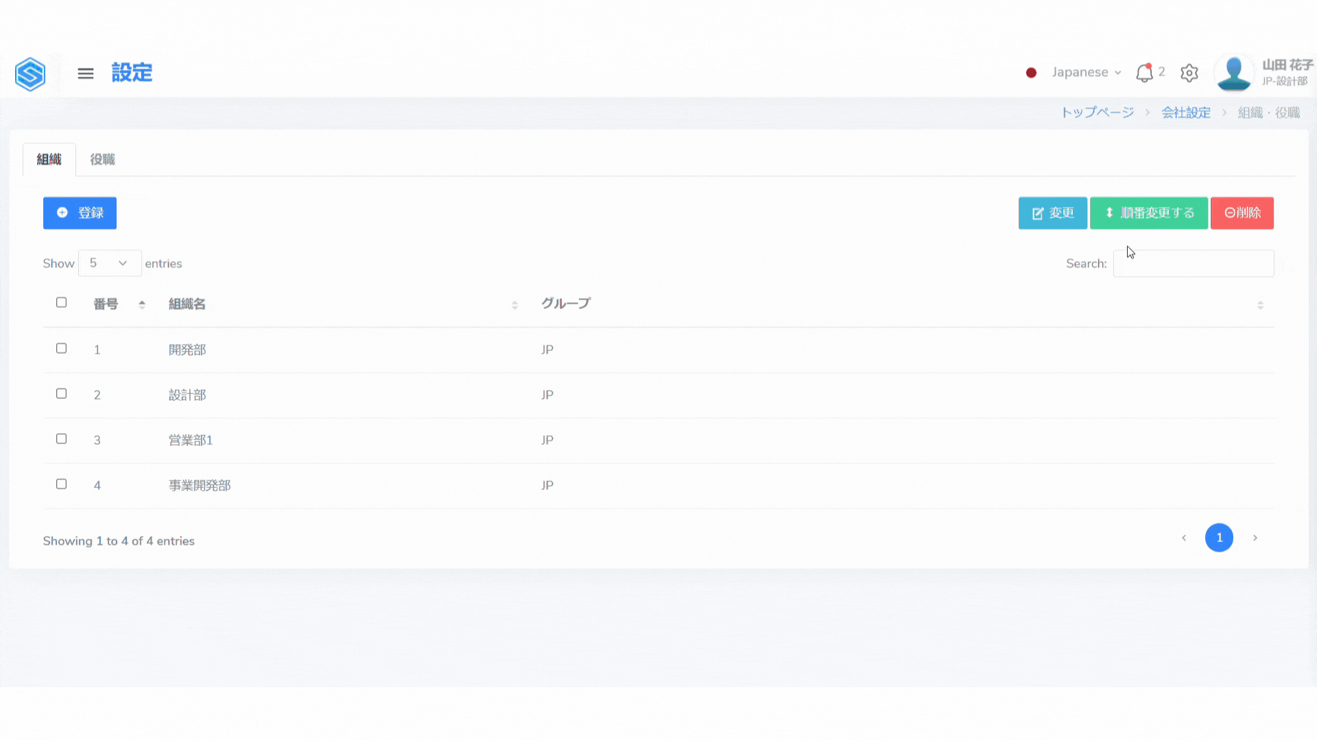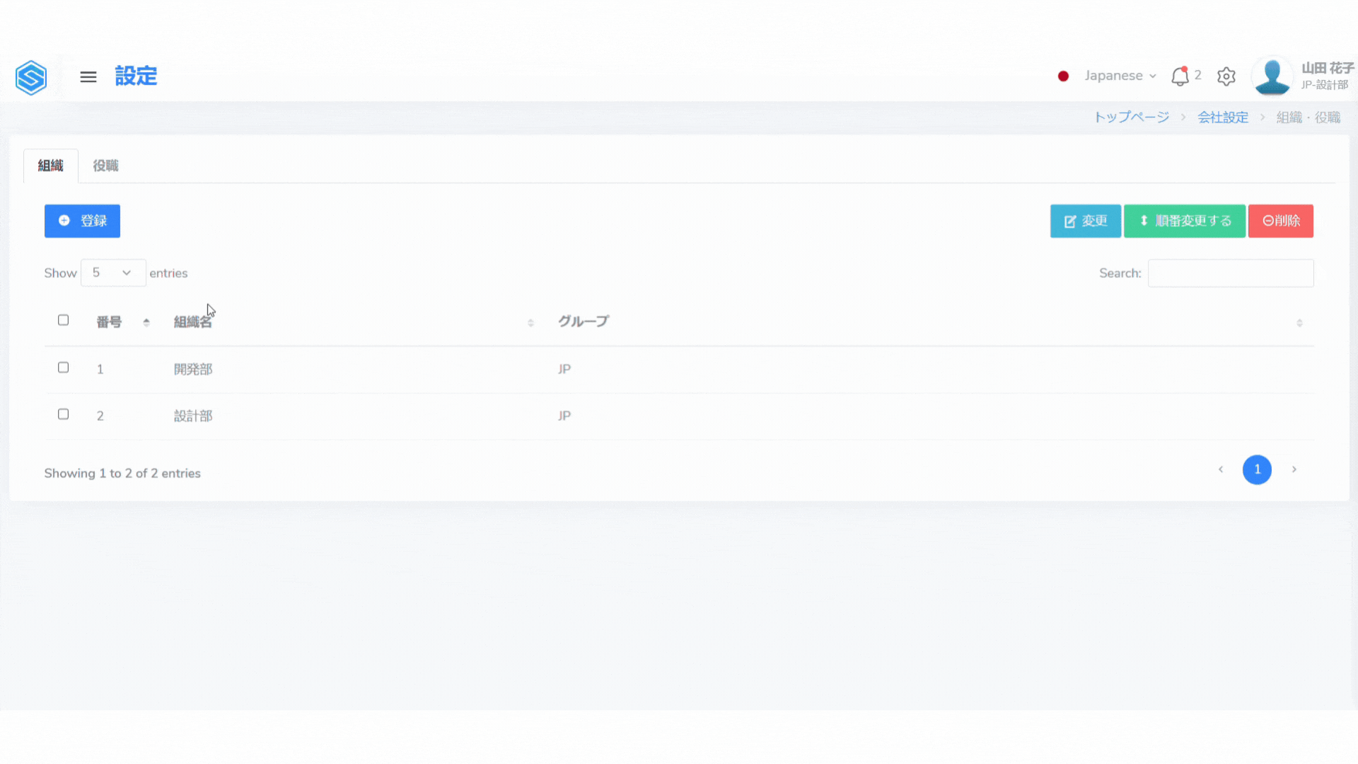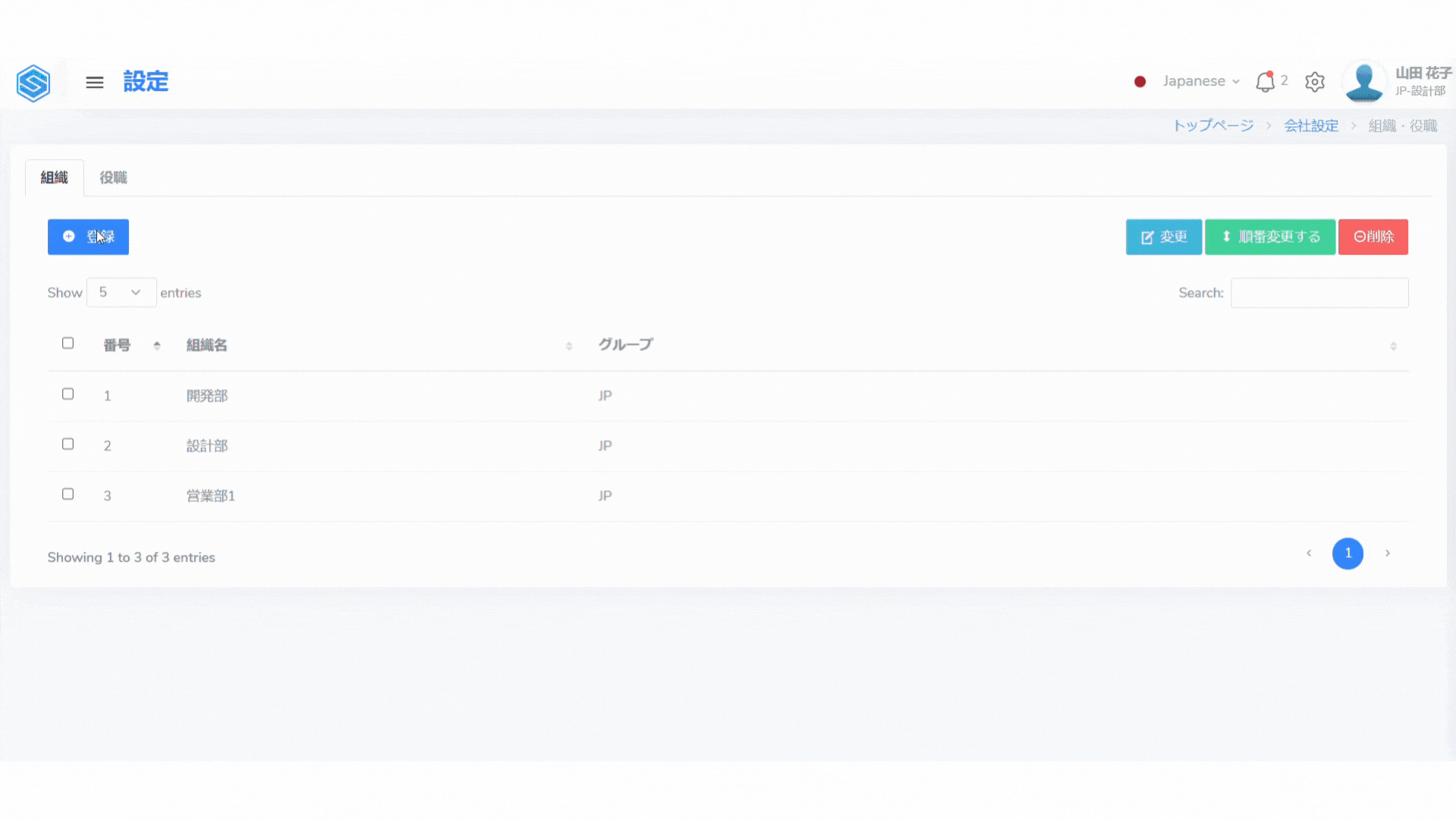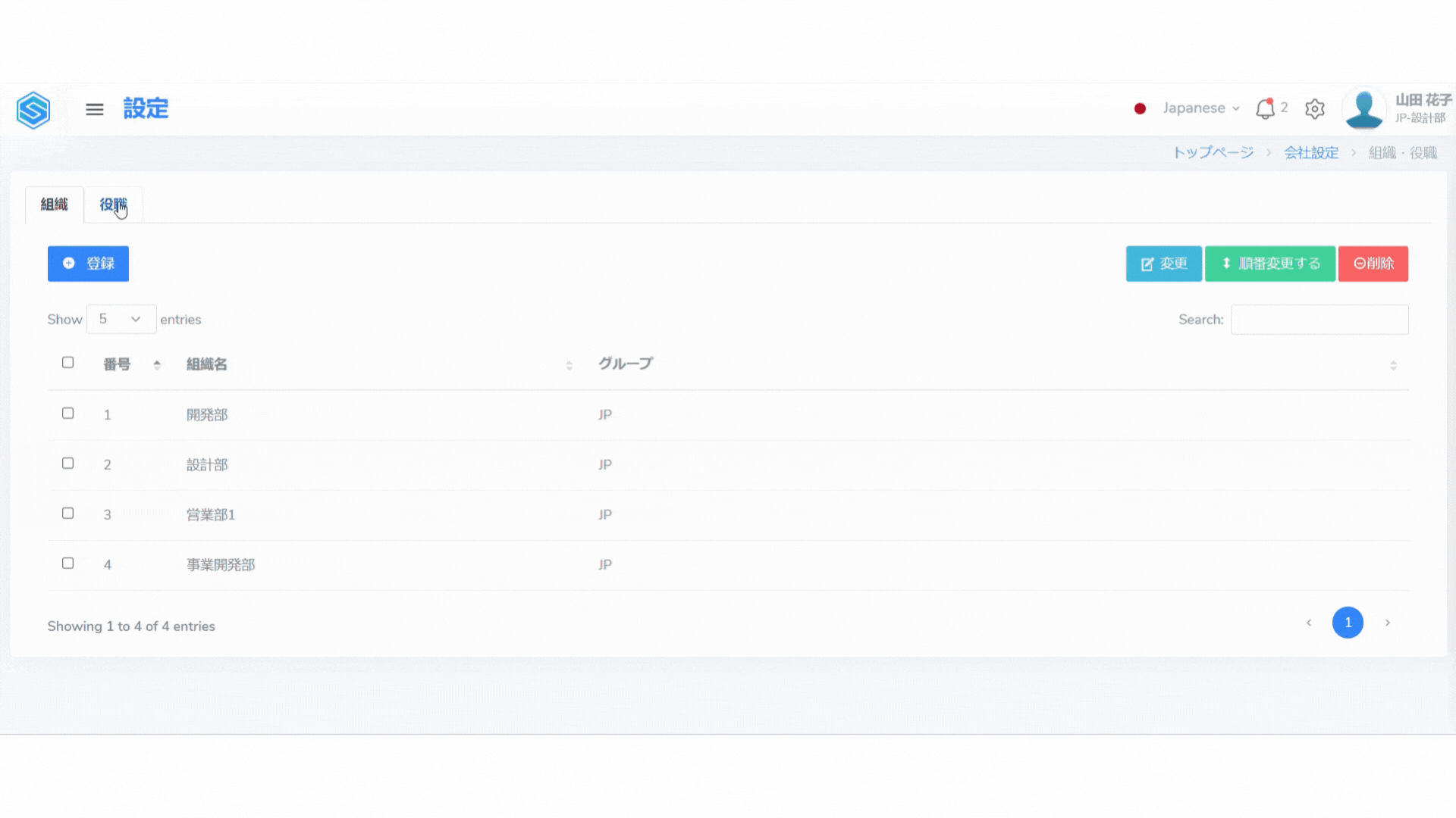 組織または役職のタブを選択し、「順番変更する」のボタンをクリックすると、「組織の順番変更」ウィンドウが開きます。順番を変更したい組織・役職をクリックし、矢印で順番を変更します。順番が決まったら、「変更する」をクリックすると更新されます。