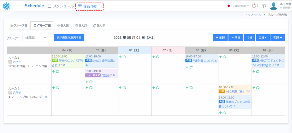 施設予約をするには、設定バーの「施設予約」をクリックします。